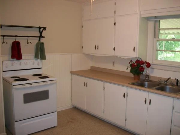 Large eat-in kitchen with white cabinets going all the way to ceiling, dishwasher, stove, disposal.